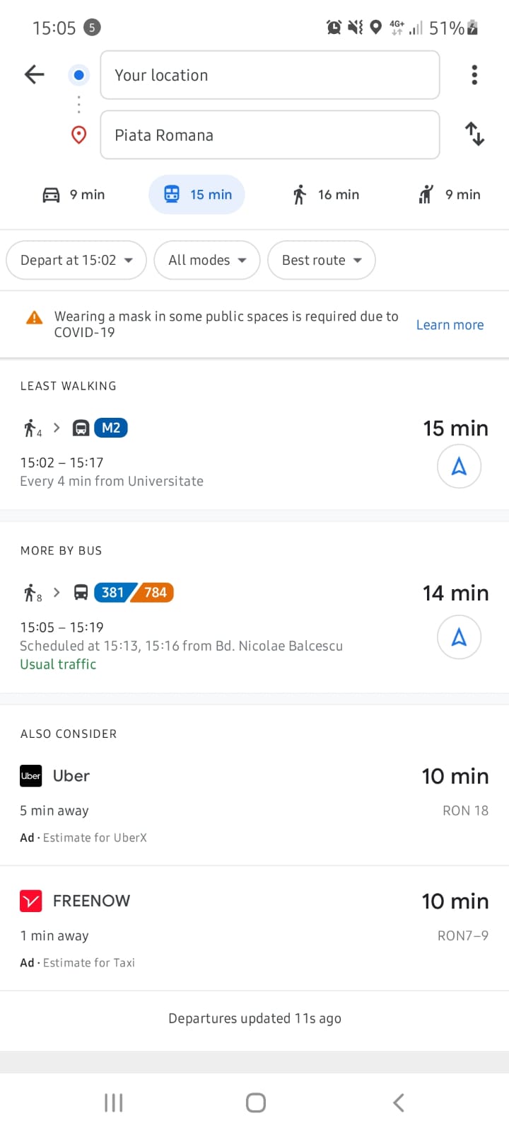 Ce e diferit la Google Maps, față de Apple Maps, e că vei primi automat toate opțiunile de transport, inclusiv costul estimativ al unei călătorii cu Uber, Bolt, FreeNow sau alte companii de ridesharing, precum și o aproximare a timpului de călătorie.