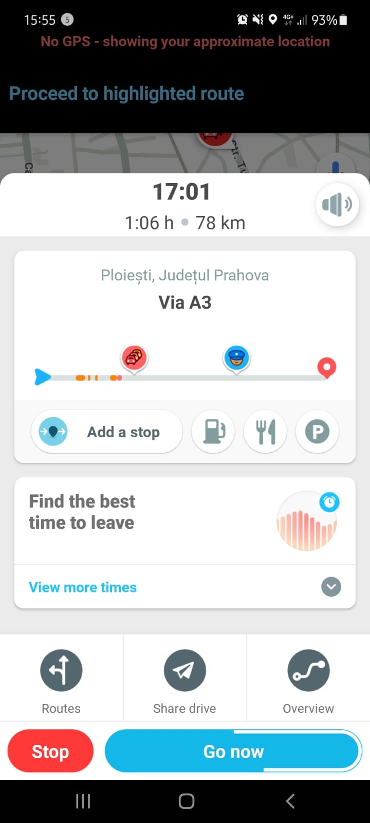 După cum poți observa mai sus, Waze va estima ora la care vei ajunge la destinația aleasă și îți va spune, în mare, care e starea traficului și dacă pe traseu vei întâlni sau nu poliție. Totodată, vei putea seta anumite opriri, vei putea căuta benzinării (apropos, dacă vei intra în meniu îți poți alege și combustibilul cu care alimentezi mașina), restaurante sau parcări.