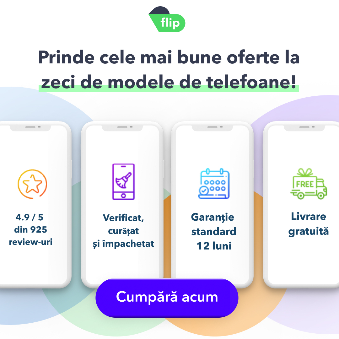 Totuși, asta nu înseamnă că nu te poți bucura de un telefon impecabil, la un preț excelent. Intră pe Flip.ro, la secțiunea Cumpără și selectează din meniu filtrul Ca nou, pentru a vedea ofertele noastre la telefoane second-hand recondiționate ca noi, verificate de specialiști, cu garanție 12 luni, transport gratuit și drept de retur de 14 zile.