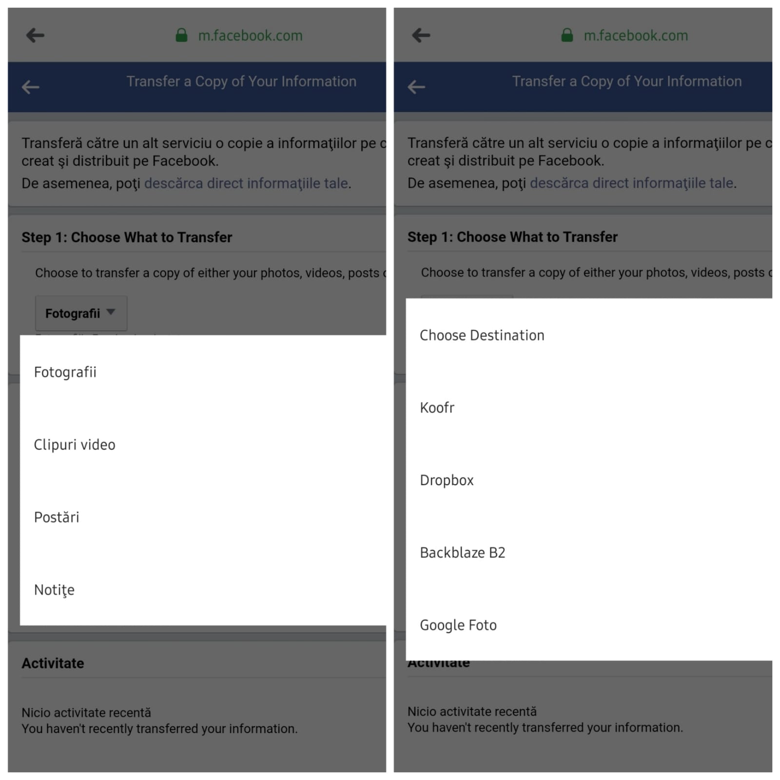 5. Se va deschide un nou meniu, de unde poți selecta atât datele pe care vrei să le transferi (poze, clipuri video, postări sau notițe), cât și destinația acestora (Google Photos, Dropbox etc.).