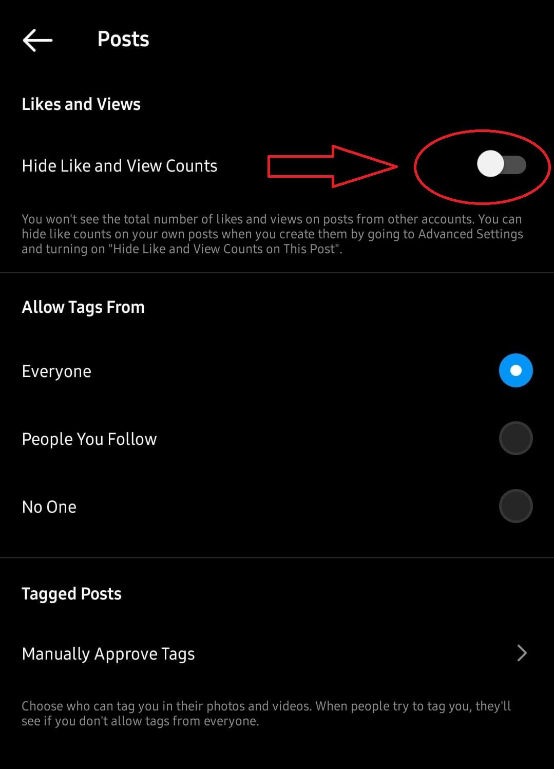 - apasă butonul-slide din dreapta, sus, din dreptul Hide Like and View Counts;