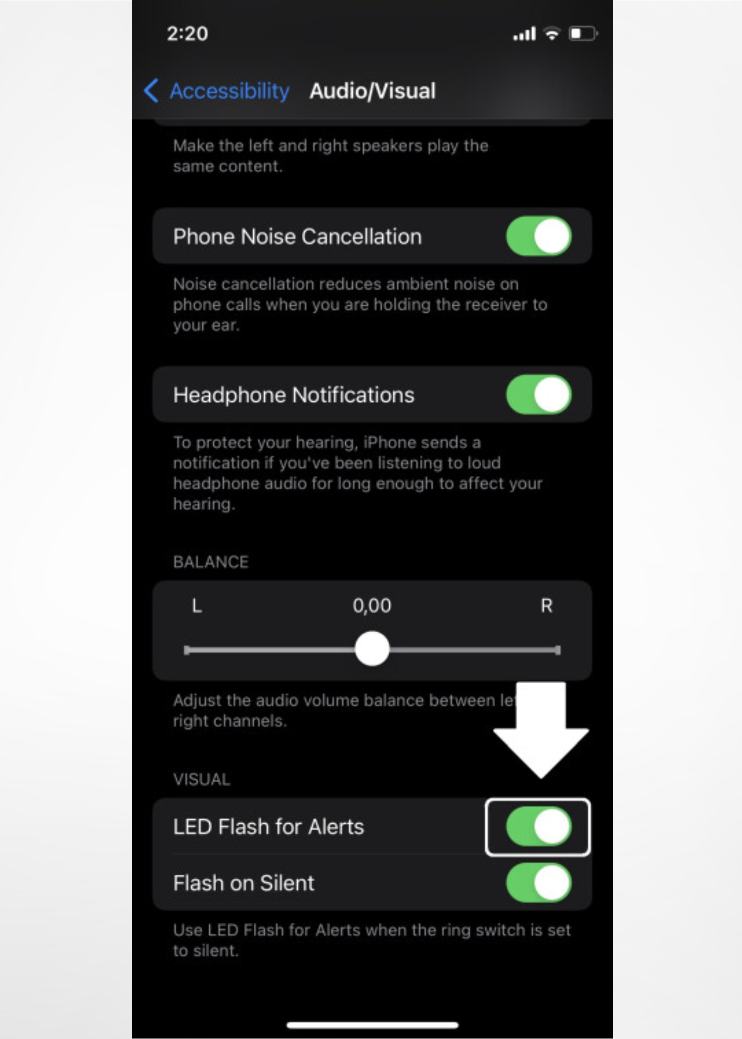 Pentru a o activa, intră la Settings, caută Accessibility și găsește categoria Audio/Visual. Acolo vei avea posibilitatea de a selecta LED Flash for Alerts, funcție care îți va permite să vezi dacă te-a sunat cineva, chiar dacă ai telefonul pe modul silențios.