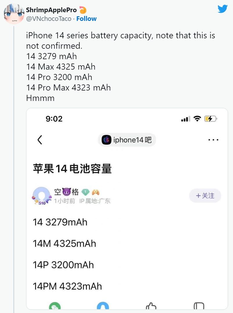 Cel mai recent leak, postat de pe contul ShrimpApplePro pe Twitter, susține că viitoarea generație de telefoane Apple va primi un boost pe partea de baterie. Concret, în postare se precizează care va fi capacitatea acumulatorilor celor patru modele pe care abia așteptăm să le testăm, adică iPhone 14, iPhone 14 Max, iPhone 14 Pro și iPhone 14 Pro Max.