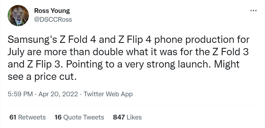 Leakerul a anunțat că producția Z Fold 4 și Z Flip 4 va fi dublată, în comparație cu cea a modelelor din seria 3, ceea ce ne duce cu gândul la faptul că Samsung și-a propus să scadă din prețul la care vom vedea lansate noile modele de telefoane pliabile.