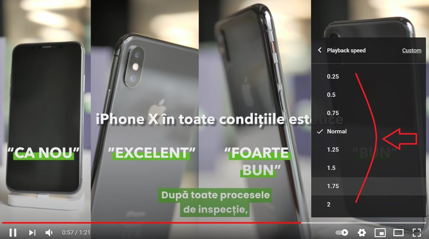 Poți alege să urmărești videourile tale preferate la viteze de 0,25, 0,5, 0,75, 1,25, 1,5, 1,75 sau de două ori mai mari decât originalul. În plus, platforma îți pune la dispoziție și posibilitatea de a adapta manual viteza la care preferi să vizionezi clipul.