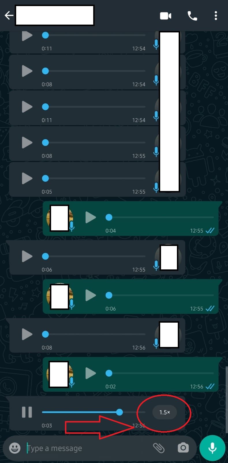 Dă play oricărui mesaj vocal de pe WhatsApp. Poza celui care ți-a trimis înregistrarea audio va dispărea, dacă vei apăsa pe ea, în dreptul mesajului trimis. În locul acesteia, vei avea opțiunea de a asculta mesajul la 1x, 1,5x sau 2x.